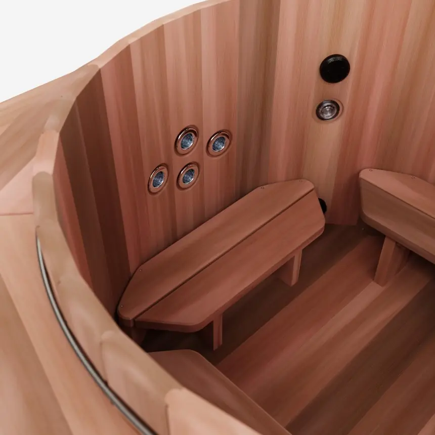 Red Cedar Clear 2 Vertical Grain tank with 3 stainless steel 12mm bar rings / 6 circular benches (4 classic benches for model 150) / 1 R24 type insulated cover / 38mm thick staves / 16 jets (12 for model 150) / 2 venturi settings with stainless steel trim (1 for model 150) / 1 colour-changing LED spotlight.