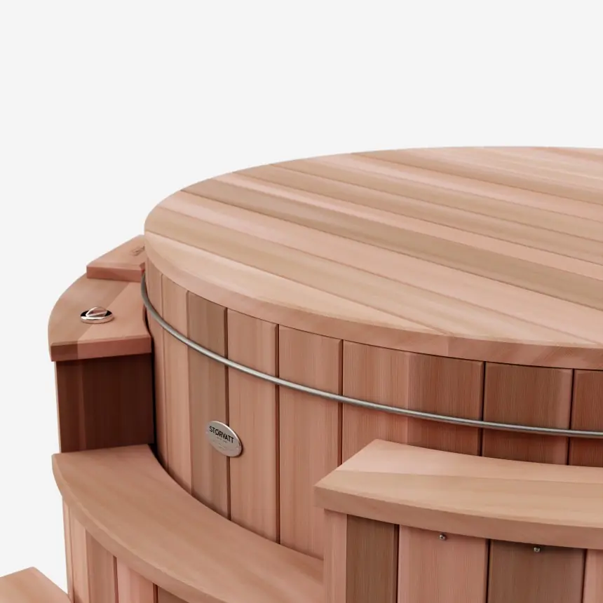Le spa en bois Størvatt hors-sol, modèle breveté, se distingue par son unicité. Son revêtement circulaire en Red Cedar massif de 38 mm d'épaisseur confère une esthétique épurée ainsi qu'une excellente isolation thermique.